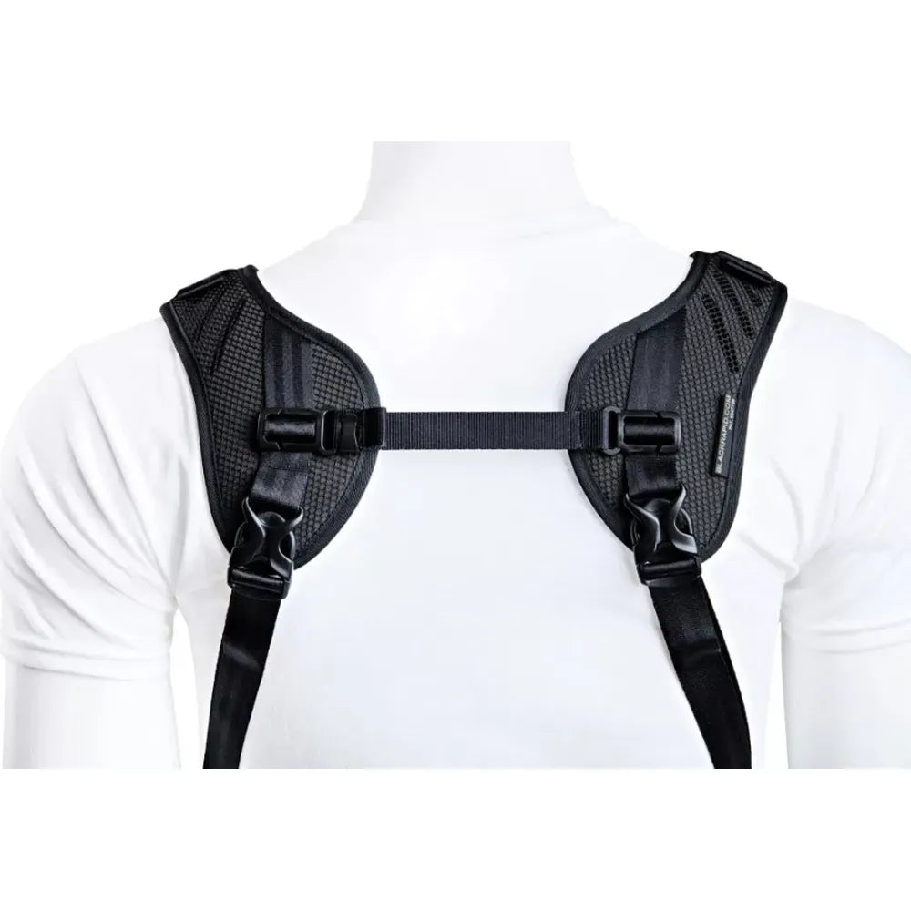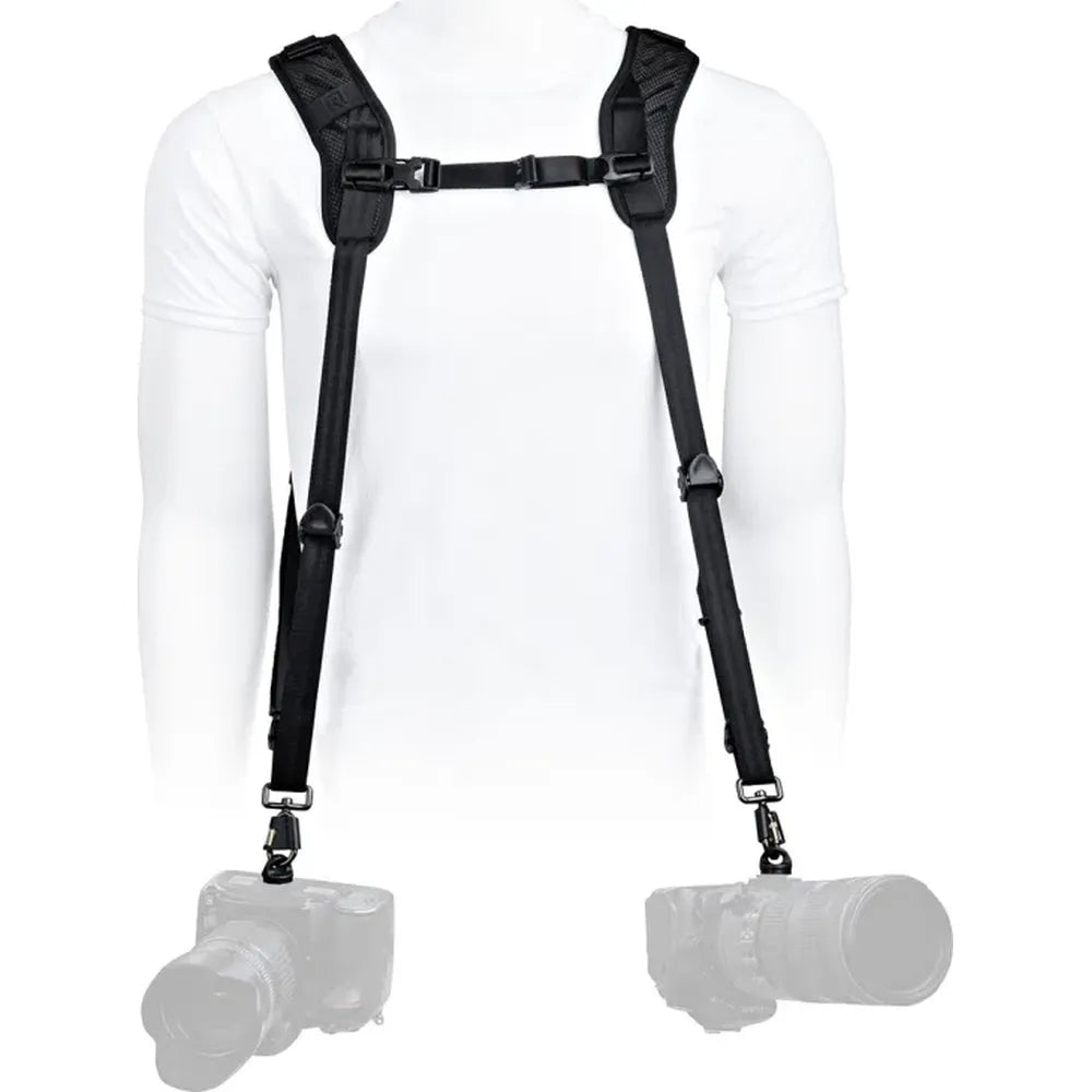 Featuring BlackRapid’s patented ergonomic shoulder pads, made from ultra-light polyester mesh, TPE foam and moisture-wicking air mesh, it keeps you cool and dry while carrying two cameras - whether DSLR, mirrorless, or both. The harness style distributes weight evenly, with each camera resting securely at your hips for quick, smooth access.