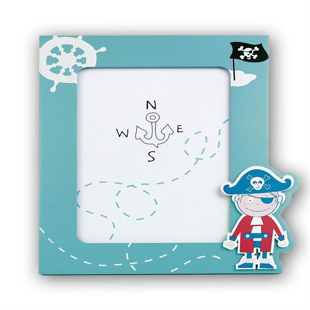 The Davide Pirate 4x4 inch Photo Frame is such a lovely frame and perfect for a nursery or child's bedroom. The soft sheen finish and beautiful pale blue background, along with the jolly pirate, makes it a cheerful frame and great for children. The jolly roger flag flutters on the top right hand side in a sinister black, to give great contrast and the slightly curved edges on the inside of the aperture give a soft finish. The photograph is easily slipped into the frame from the back and overall size of the frame is approximately 6.5 x 7inches.