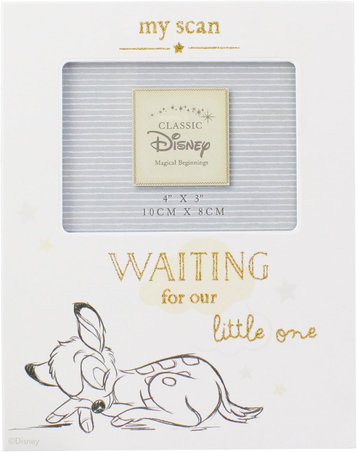 A Bambi baby scan photo frame from DISNEY®. This adorable Magical Beginnings frame makes a treasured keepsake designed specifically for baby scans to be proudly displayed in anticipation for their arrival. It displays a beautifully printed image of the much-loved Bambi, complete with ‘My Scan - Waiting for Our Little One’ sentiment in gold lettering. The freestanding frame features a single landscape aperture – which is perfect for a scan photo – and would make a delightful gift for those welcoming a new bundle of joy into their home.