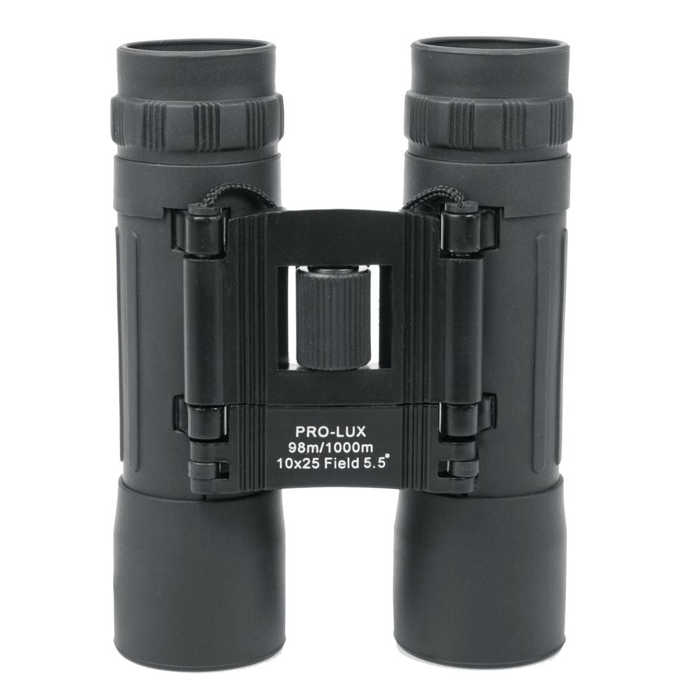 The Pro-Lux 10x25 Binoculars are incredibly compact and a great all round binocular. They are double hinged to allow easy folding making them ultra compact and truly pocketable, so they are brilliant to take out walking or cycling. The Pro Lux 10x25 Binoculars have retractable eyepieces making them useful for customers who wear glasses, and also comfortable for use due to the rubber eyecups. The rubberised armour on these 10x25 Binoculars provide additional grip, durability and make them shockproof. The fully coated optics provide super results even in poor lighting conditions which helps viewing at dawn and dusk and these Binoculars come with a nylon case with belt loop, lanyard and 3 year warranty.