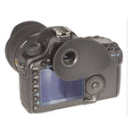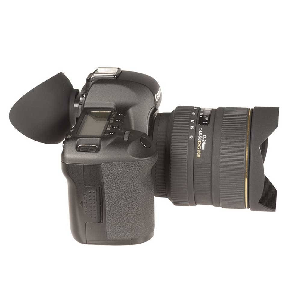 HoodEYE for shooters who wear glasses. Designed specifically for use with glasses; the oversized eyecup reaches back to cover light leaks behind your glasses. You can easily upgrade your camera eyepiece in just a few seconds.