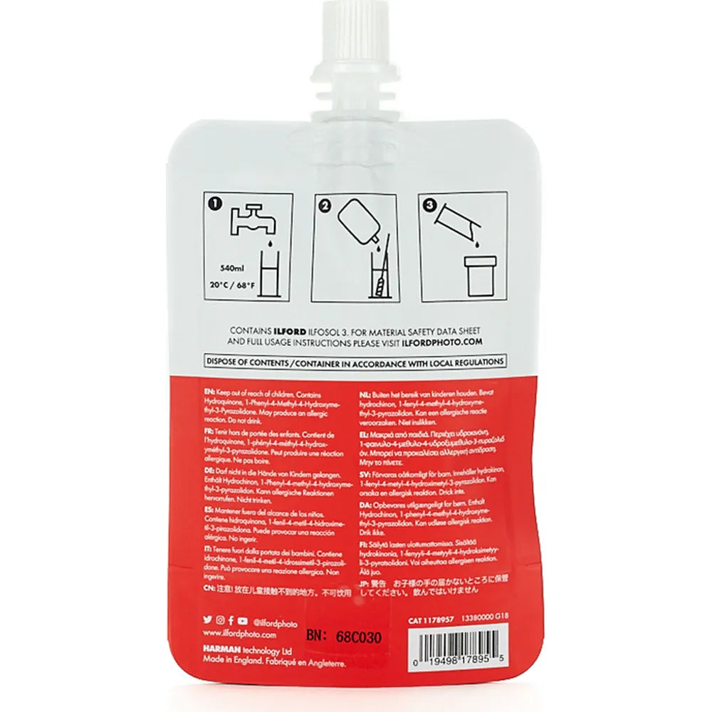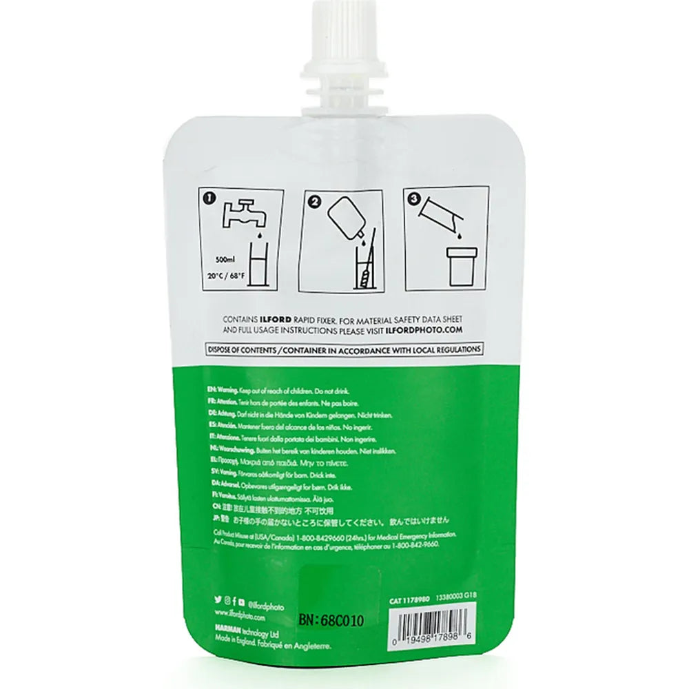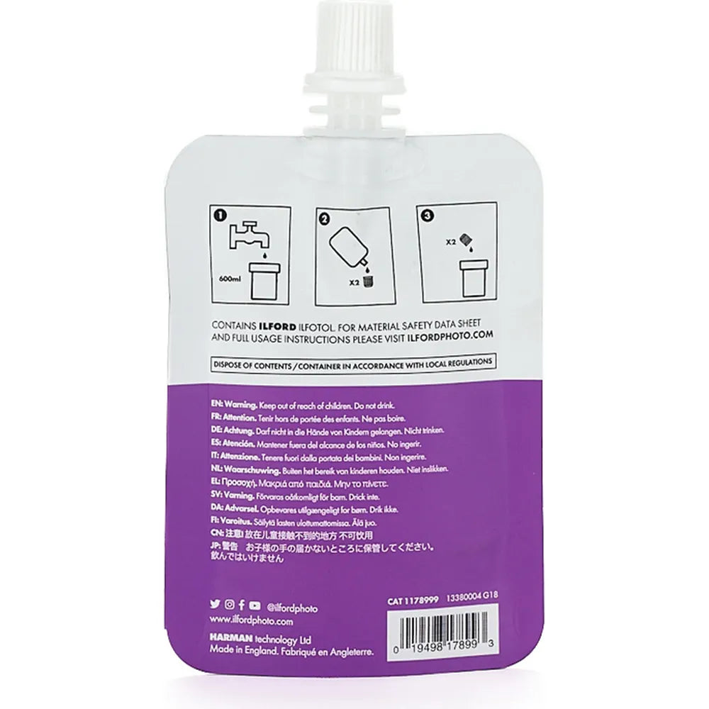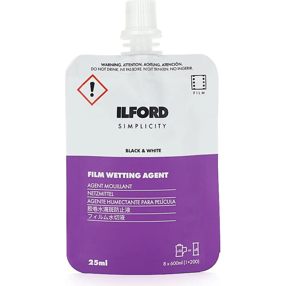The Ilford Simplicity Starter Pack includes everything you need to begin developing your own black and white film at home. Each box contains single-use sachets of film developer, stop bath, fixer, and wetting agent, making the process straightforward and convenient for beginners. Perfect for those starting out in film development with reliable, easy-to-use chemicals.