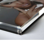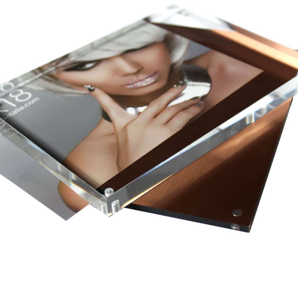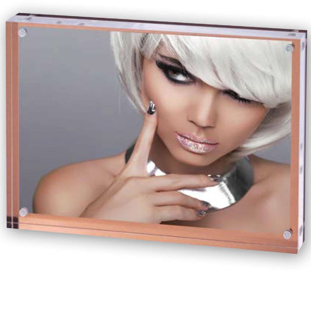 This acrylic photo block is designed to stand out with its unique features. The frame easily separates to allow for insertion of any photo up to 7x5 inches, and is held in place by four small magnets. The back panel has a beautiful bronze finish that adds an extra touch of elegance to the photo displayed inside. Measuring 3/4 of an inch in depth, this frame provides stability and can be displayed in both landscape and portrait mode, making it a perfect addition to any modern decor.