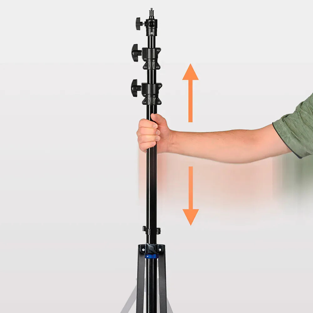 The Kaiser Autofold S Light Stand makes setup fast and effortless with its smart leg-folding design. Its aluminium centre column with air cushion extends from 78 to 240 cm, and the reversible 16 mm thread pin lets you mount lights horizontally or vertically. Lightweight yet sturdy, it supports up to 2.5 kg, folds down to 78 cm, and is perfect for both studio and location shoots.