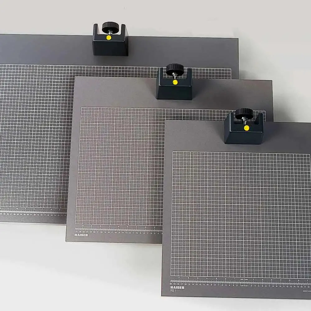 The Kaiser Copy Base Board - 80 × 60 cm provides a stable, matt grey surface with a fine grid (cm/inches) for precise positioning. Height-adjustable feet and an integrated spirit level ensure perfect alignment. Designed for attaching Kaiser columns, it’s ideal for copy and reproduction photography.