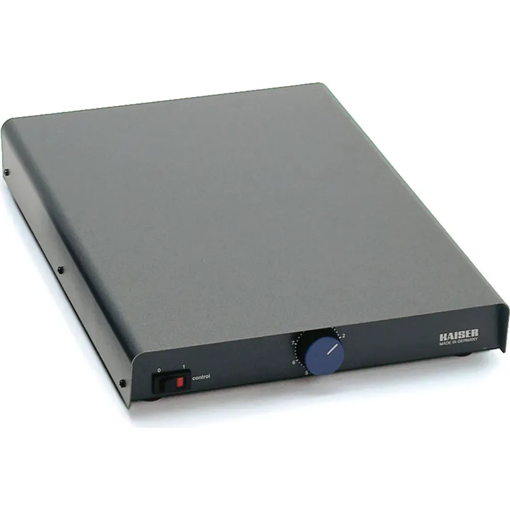 The Kaiser Dish Warmer features a durable all-metal housing with a sleek black stoved-enamelled finish. Its adjustable thermostat provides automatic temperature control, maintaining a stable range of 20–45 °C (68–113 °F) with ±0.5° tolerance.