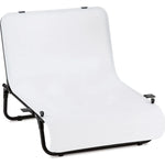 The table features a foldable tubular steel frame and a white translucent plastic sheet with a pre-formed front edge, creating a seamless backdrop without visual distractions. Set up and take down are quick and require no tools, while the folding design allows space-saving storage. Non-skid feet keep the table stable, and holding provisions on both sides make it easy to attach accessories.