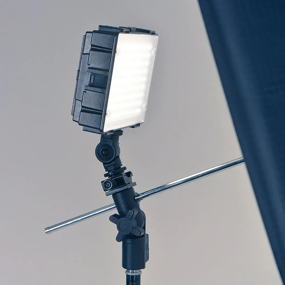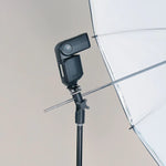 The upper section tilts and locks in precise detent stops, providing versatile positioning. An integrated umbrella mount (ø approx. 7.9 mm) further enhances creative lighting options. With a compact height of approx. 105 mm, this durable joint is ideal for both studio and location setups.