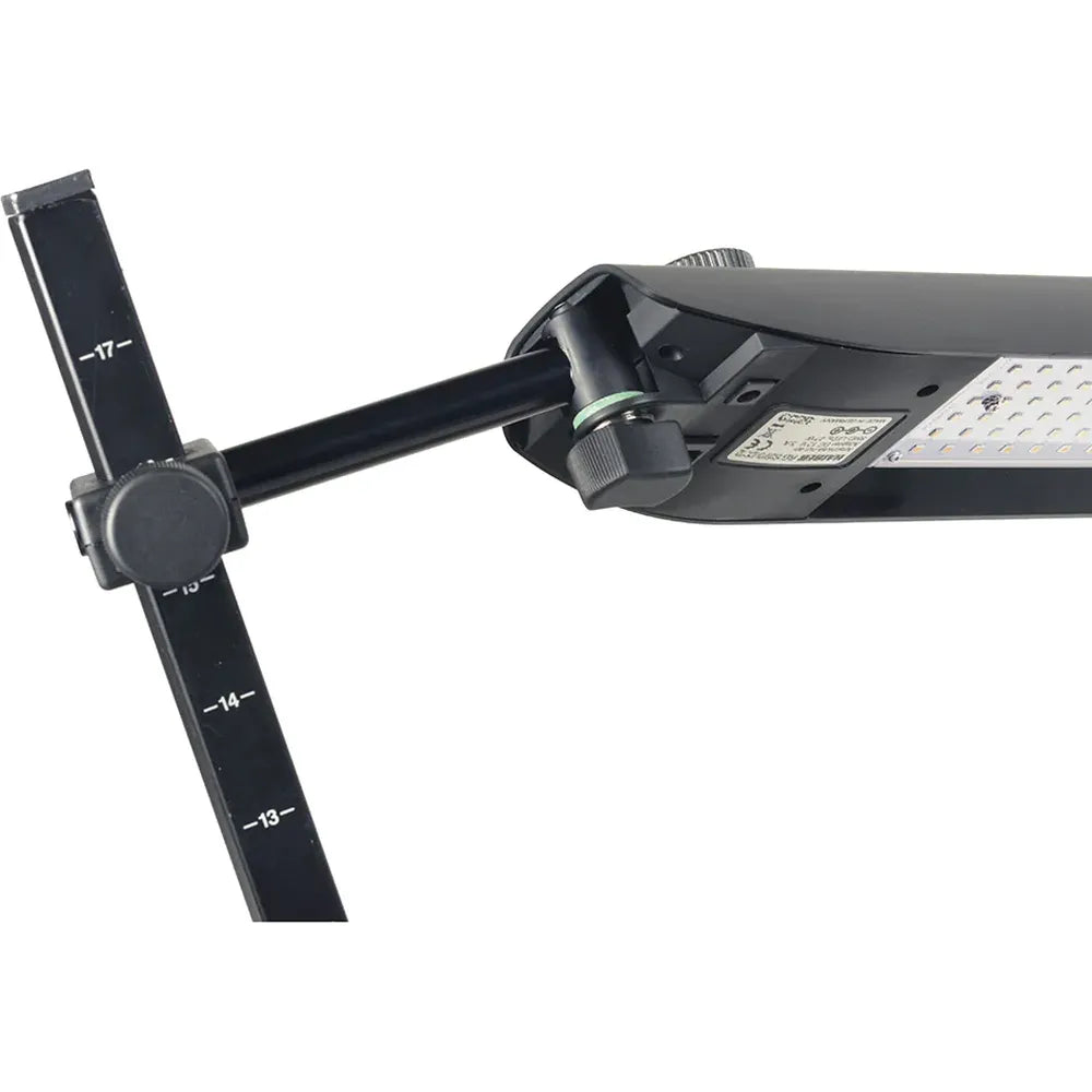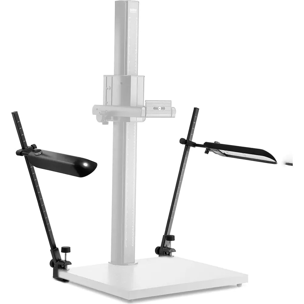 Flexible & precise: Tiltable, swivelable, and height-adjustable lights with vertical arms featuring detent tilting ensure reproducible setups. Die-cast clamp bases (up to 48 mm / 1.9 in.) provide secure mounting. A removable diffusing cover (K5466) creates soft, even illumination.