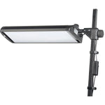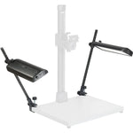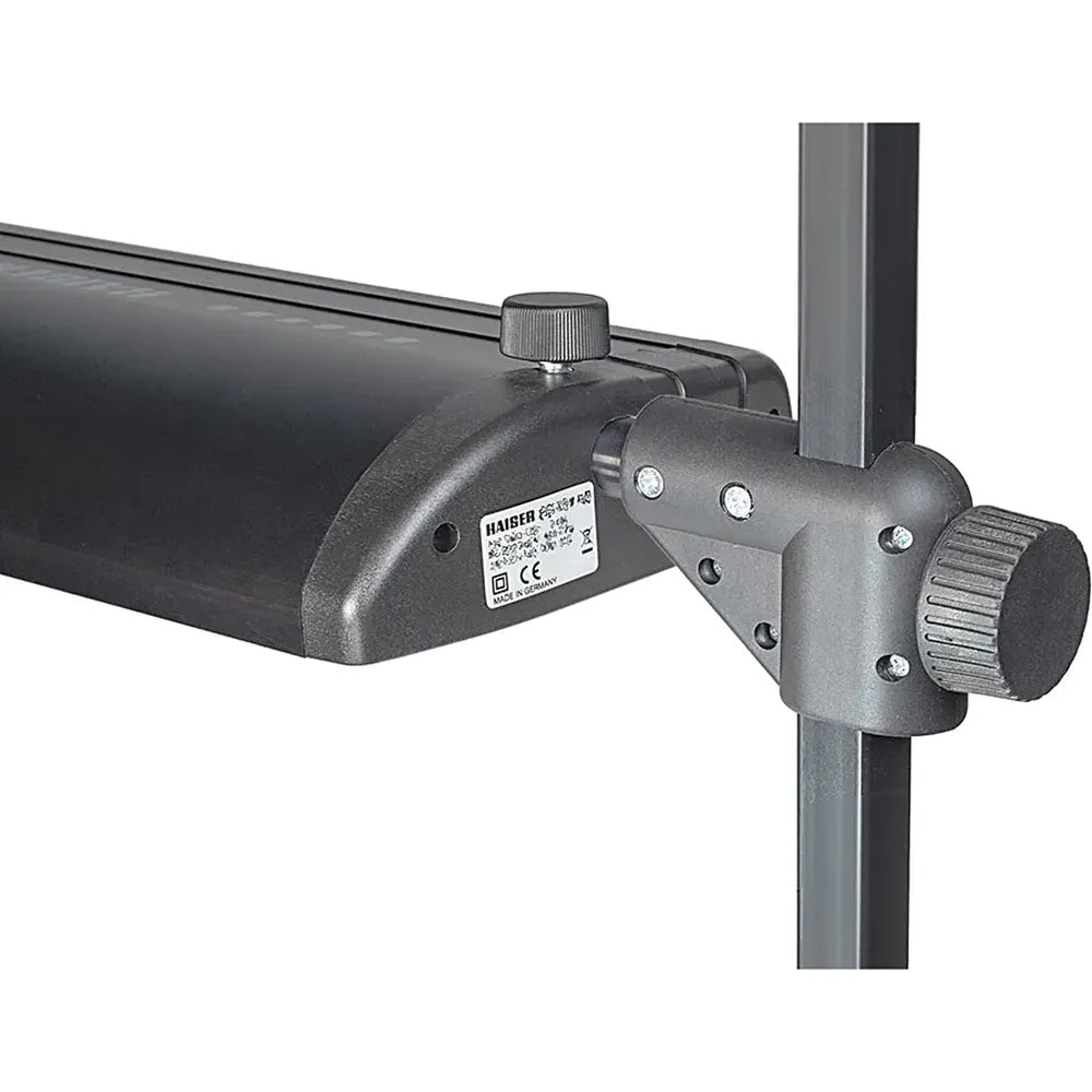 Flexible & precise: Lamp housings are made of anodised aluminium, swivelable, shiftable, and height-adjustable, with detachable soft screens for diffused lighting. Vertical arms feature height markings and tiltable detent joints for reproducible setups. Strong cast aluminium clamps (up to 48 mm / 1.9 in.) provide secure mounting.