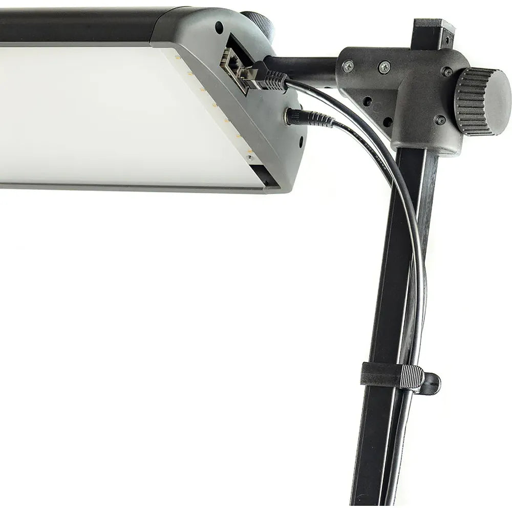 Matched light panels create homogeneous illumination with symmetrical alignment. The unit features an illuminated info screen and a memory function, recalling the last brightness setting at switch-on. Detachable soft screens allow flexible lighting adjustments.