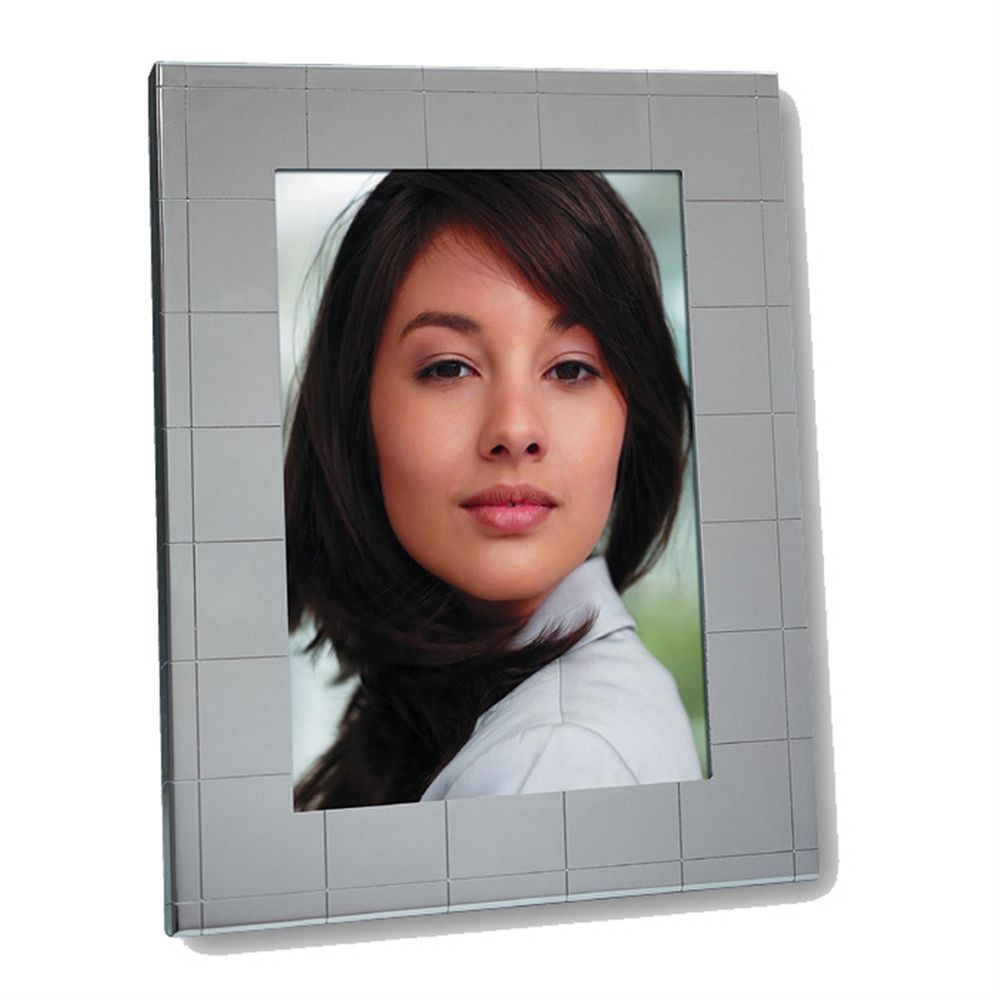 The Laura Square 7x5 Photo Frame is a stylish, modern choice with a sleek silver finish. Its contemporary design features an elegant square pattern embossed onto the metal, adding subtle texture and charm. The frame features a luxurious black velvet back that can be easily removed for quick photo insertion. Designed for versatility, it can be displayed either freestanding or wall-mounted, making it perfect for any room. The overall dimensions of the frame are approximately 9x7 inches.