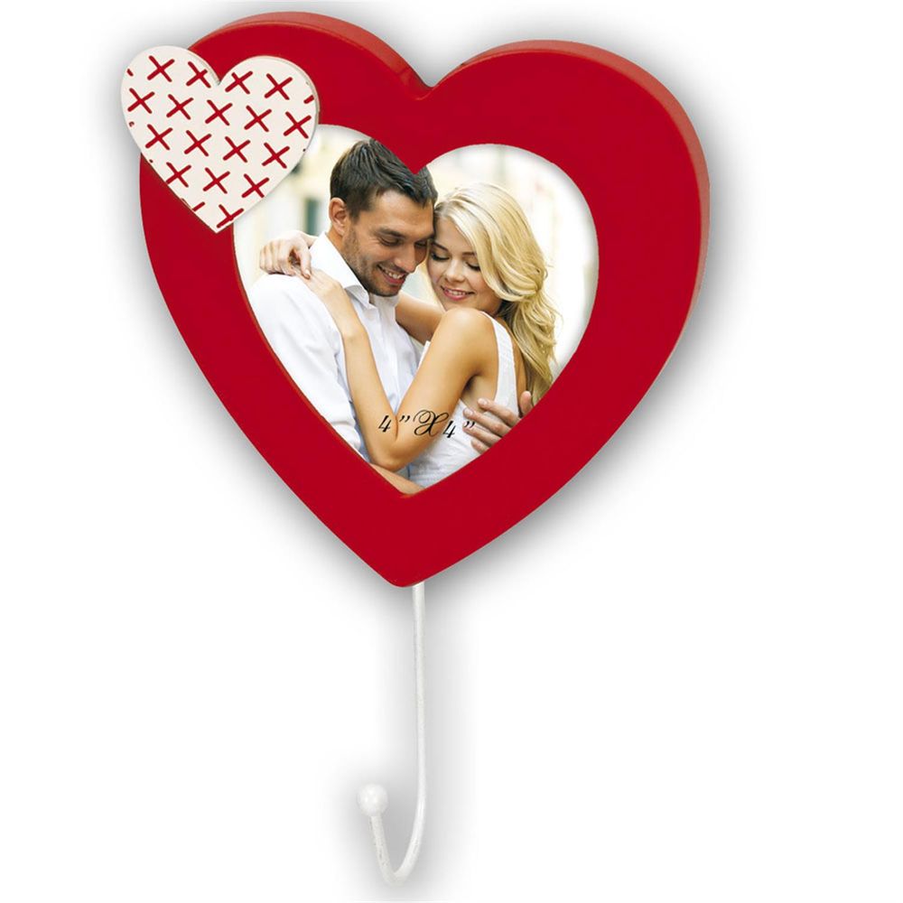 This is a terrific idea, as it is a coat or clothes hook that has abeautiful heart-shaped aperture attached to it, which will take a 4x4 inch photograph. The miniture heart in red and white crosses, is attached to the top right hand side of the larger bright red heart for added interest and contrast and fits well against the matt red of the bigger heart. The front of the frame is glass thereby offering great protection and the photograph is easily fitted into the back of the frame by unclipping the backboard. The strong hook, ensures that the heart remains in place on the wall and the metal clothes hook which hangs below it has a ball on the end of it for protection. The overall size of the frame and hook is 8.5 x 5.5 inches. so perfect for a hallway or bedroom.