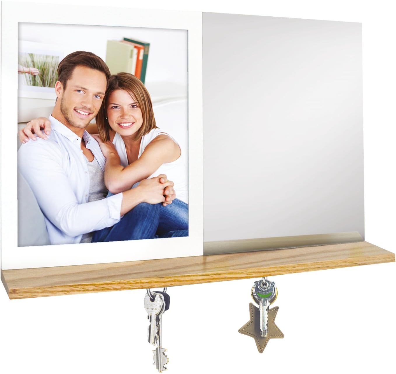 This is a terrific idea for any home and makes a great gift. A useful mirror on one side and a place for your favourite 10x8 inch photo on the other, what could be better? The glass front on the aperture, ensures that the photograph stays clean and protected and the high quality mirror on the right is perfect for everyday use. Measuring 18.5x12x3 inches overall, the width of the frame is approximately 1 inch top and bottom and then just under an inch on either side; this keeps all the proportions correct and means that the picture balances well with the frame. The upright frame is approximately half an inch deep, with the mirror safely recessed into it and the smooth edges of the mirror gives it a high quality, finished feel. The frame is made from MDF, which is painted off white, to contrast with the brown, light oak wood base, which is substantial enough to stand the unit safely.