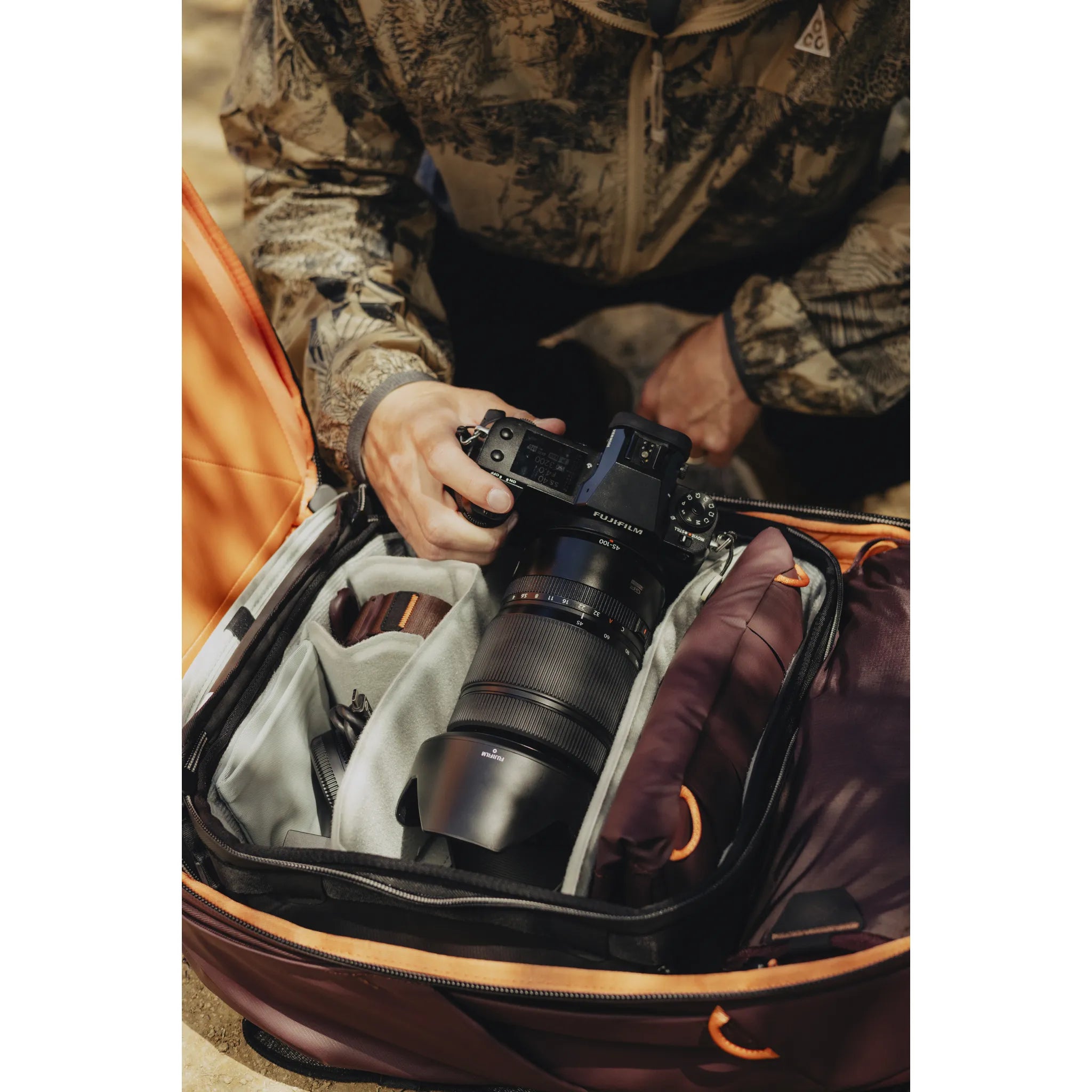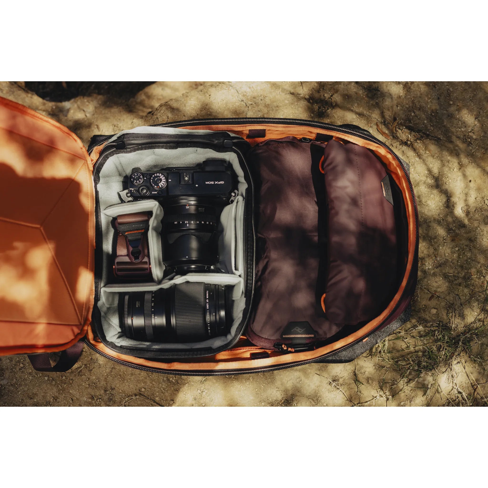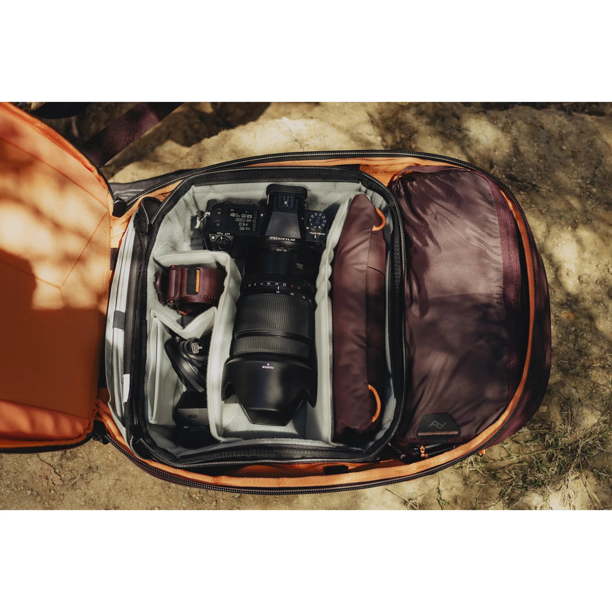 Works seamlessly with Peak Design Packing Cubes and pouches (sold separately). Fits Peak Design Camera Cubes, but only in its expanded form. The larger 45L Backpack is better for Photography equipment carrying.