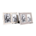 This stylish double frame has apertures for 2 photos to be displayed side by side in portrait view. Suitable for 6 x 4 inch photos. The inner frame is finished in an eyecatching chrome effect and each individual frame is set in a beige fabric surround.