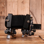 Used Kenlock Swing & Shift Bellows with Olympus OM mount. This precision bellows unit enables swing and shift movements for selective focus control and perspective correction on 35mm OM-mount cameras. Ideal for macro work, product photography, and architectural imaging where precise depth-of-field management is essential. The mechanical construction allows smooth, repeatable adjustments. A versatile accessory for photographers seeking advanced compositional control. Condition: Used, fully functional.