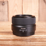 # Used Nikon Z 24mm F1.7 Lens A versatile wide-angle prime for Nikon Z mirrorless cameras, this 24mm F1.7 delivers exceptional optical performance across diverse shooting scenarios. The fast f/1.7 aperture excels in low-light conditions whilst enabling precise subject isolation through shallow depth of field. Compact and lightweight, it's ideal for travel, street, and environmental portraiture. As a used item, it represents excellent value for photographers seeking premium optics without the premium price tag. Fully compatible with Z-mount bodies, this lens combines optical excellence with practical handling.