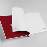 This traditional Walther Wedding Album features a high-quality cover with embossed 'Love' lettering and small, white hearts all over, as well as a heart cut-out on the front. The album measures 28x30.5 cm and contains 50 white pages made of acid-free photo cardboard with white glassine protective pages. Additionally, it comes with a 2-page illustrated front cover and is equipped with a CD and a negative archive.