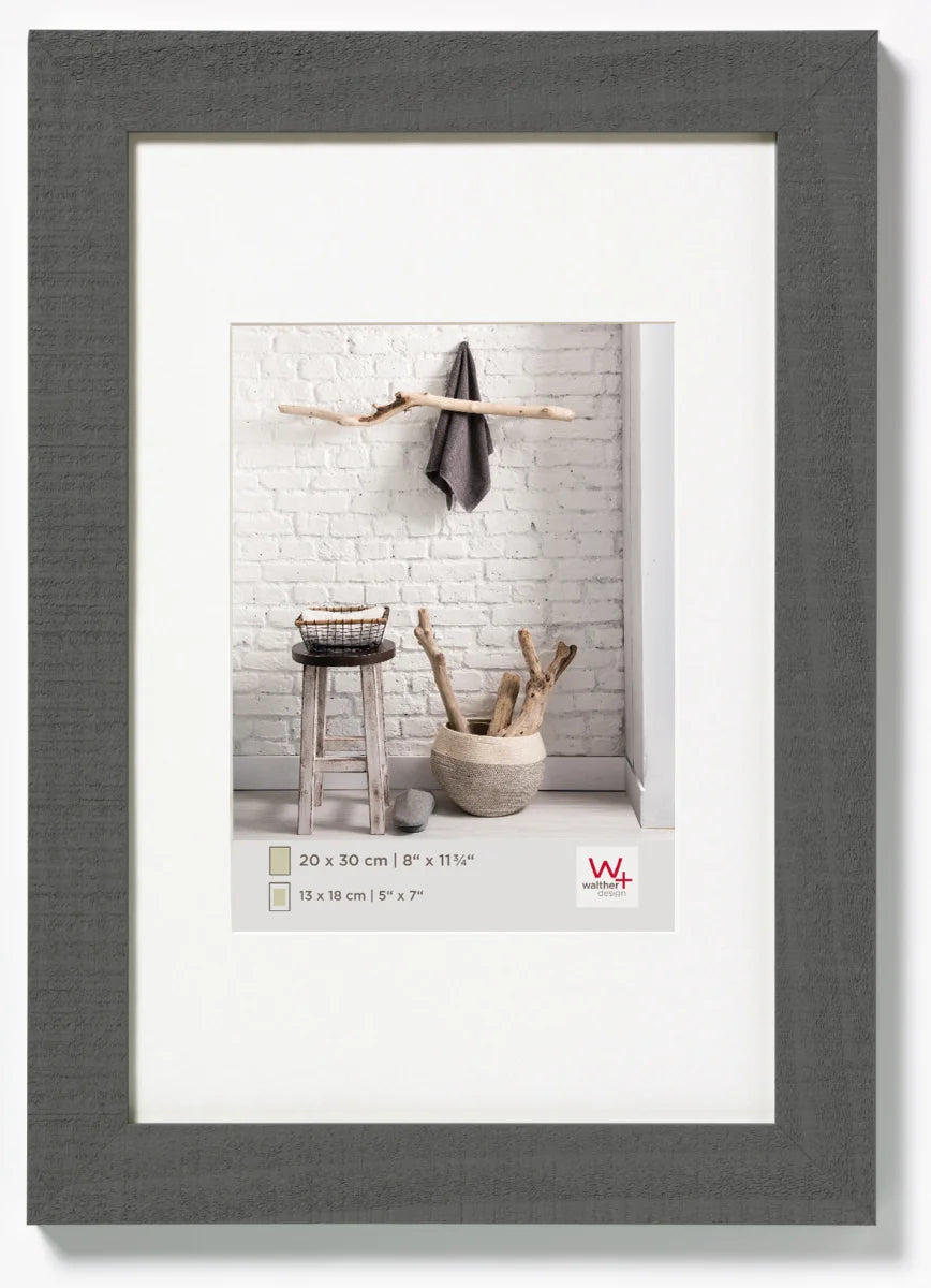 This wooden frame features a textured finish, creating a rustic aesthetic. Inserting a photograph is simple - just remove the back and place the photo inside, secured by the glass front which protects against dust and dirt. The sturdy metal clips on the back keep the backboard firmly in place, while the square edge profile adds a contemporary touch. These frames, available in various sizes and colours, are perfect for showcasing a cherished photograph. Each Walther frame also includes a FREE insert for your convenience. This frame hangs beautifully in portrait or landscape mode.