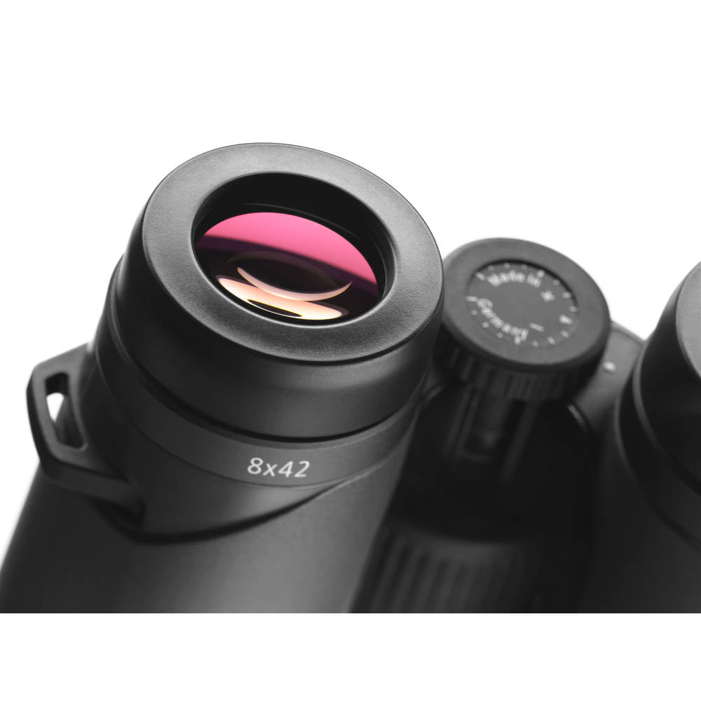 With a field of view of 148m / 1000m, the 8x magnification offers the widest, most natural view and leaves nothing hidden. The seven-lens eyepiece delivers extremely sharp focus all the way to the edges. The moderate magnification, balanced weight distribution and ergonomic grip make them easy to hold for hours of relaxing viewing. A transmission rate of 92% and large exit pupil measuring over 5 mm reveal the details in dark shadows or the dim light of dusk.